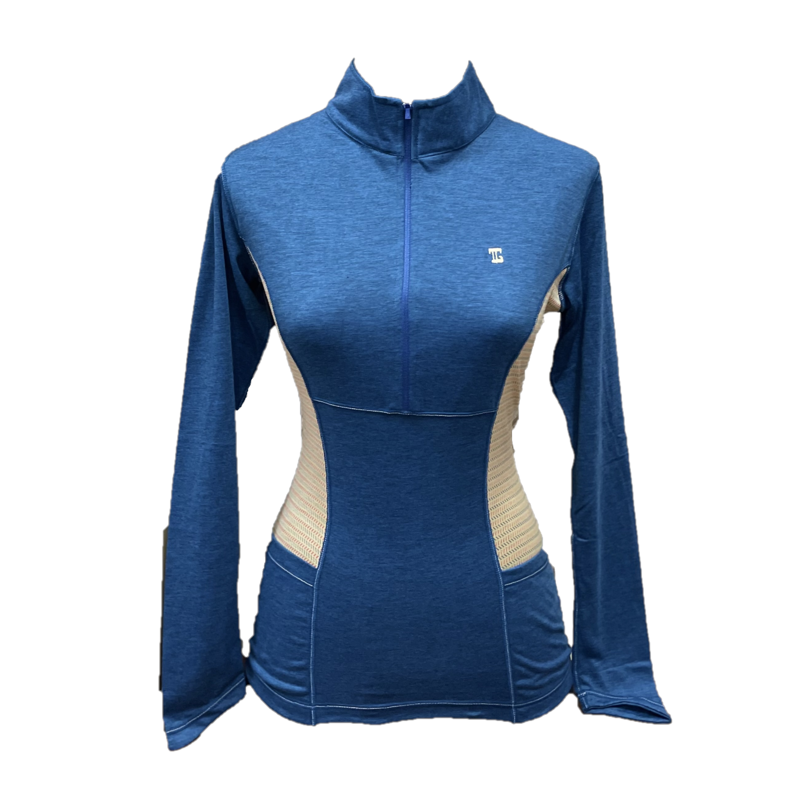 Model Number TG-LT-116A1 || Ladies Top Dark Blue with Zipper Long Sleeve with Yellow Pattern Panels on the Right and Left Sides of the Body.