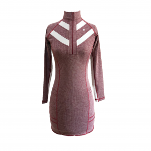 GD-019 || Golf Dress Long Sleeved Maroon Marble and White Tweed Featured Over Locked Seems with Double Hem Overlocking Textured Fabric, Wide Back Chevron Stripes 2 Each Side of Front Collar, Zip Mock Polo Neck, 2 Front Pockets with White Trim